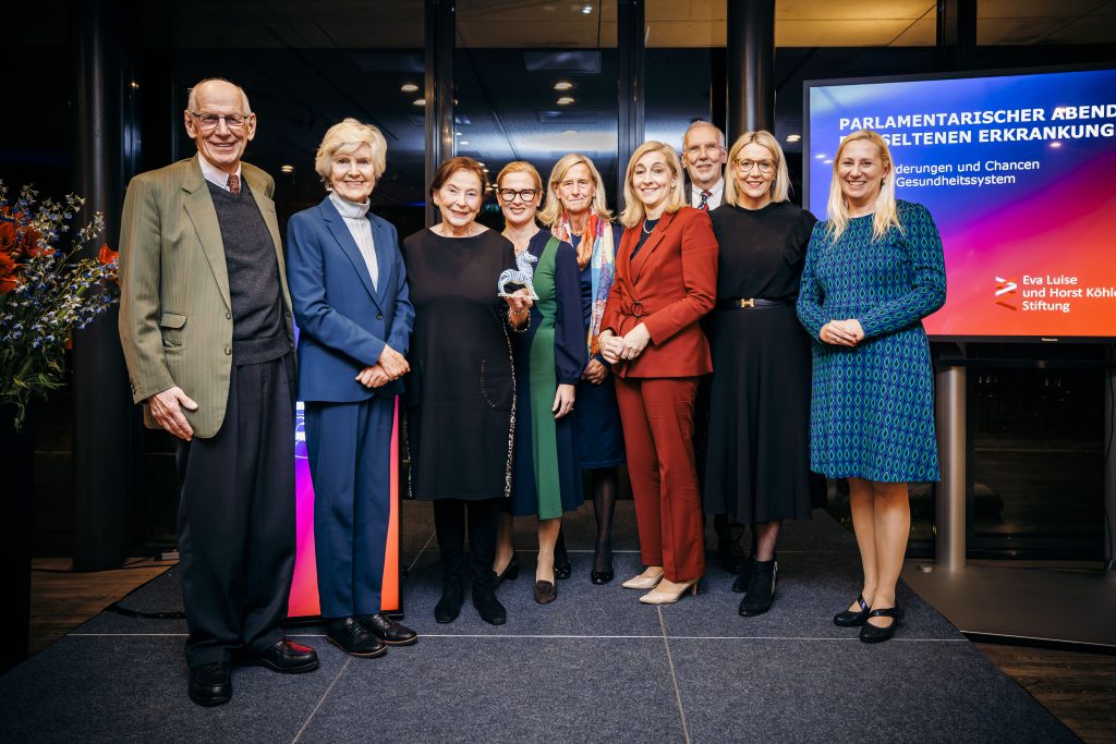 Ein emotionaler Höhepunkt des Abends war die Verleihung des Ehrenpreises für das Lebenswerk im Bereich der seltenen und unerkannten Erkrankungen an Eva Luise Köhler, die nicht nur durch ihr jahrzehntelanges Engagement für Betroffene und deren Familien herausragt, sondern auch die Eva Luise und Horst Köhler-Stiftung gegründet hat, um nachhaltige Strukturen für Menschen mit seltenen Erkrankungen zu schaffen. In ihrer Laudatio würdigte Prof. Dr. Annette Grüters-Kieslich ihre außergewöhnliche Arbeit für Betroffene und deren Familien. Die Auszeichnung wurde von unserer Schirmherrin Tanja Raab-Rhein gemeinsam mit Prof. Dr. TOF Wagner überreicht.